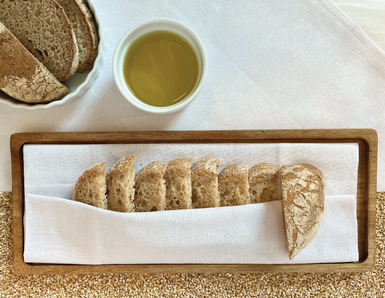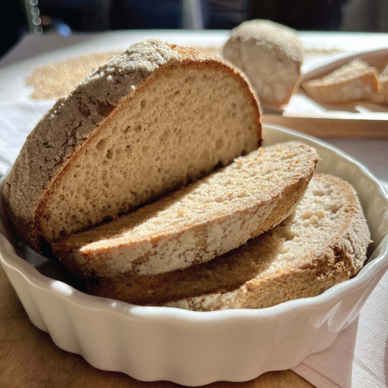 Brown rice, sorghum and buckwhear combine to make a robust, whole grain loaf inspired by the classic Italian bread of the same name. It pairs particularly well with cured meats of funky, aged cheese.